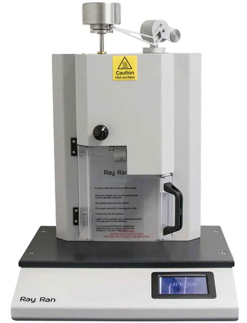 MFR300 Ray Ran Melt Flow Index Tester with digital display and caution hot surface label, used for measuring the flow rate of molten plastic.
