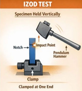 Izod impact test diagram showing a vertically clamped specimen with a notch, struck by a pendulum hammer at the impact point, with the sample fixed at one end.