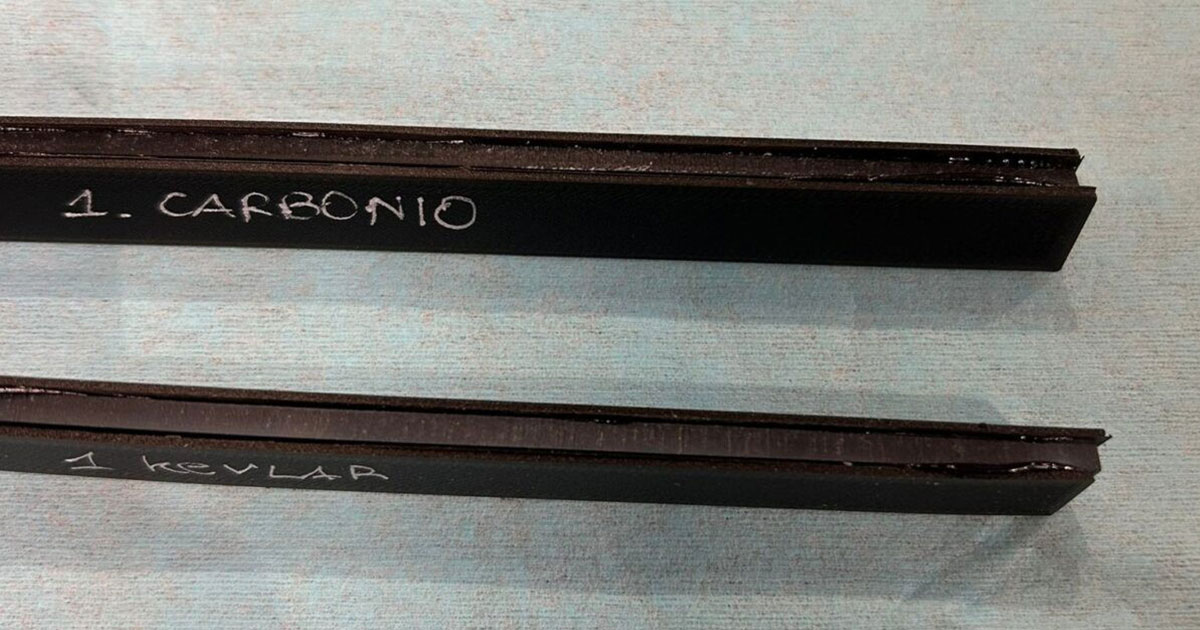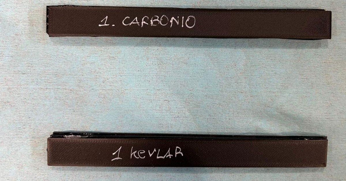 Two flat composite bars labelled “Carbonio” and “Kevlar,” shown intact before testing.