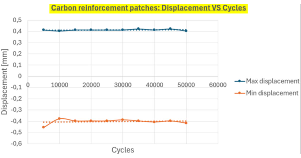 Line graph of displacement versus cycles for carbon reinforcement patches, showing stable maximum displacement around 0.4 mm and minimum displacement around -0.4 mm across 50,000 cycles.