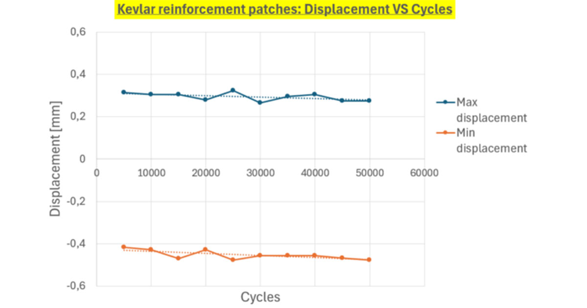 Line graph of displacement versus cycles for Kevlar reinforcement patches, showing slightly fluctuating maximum displacement around 0.3 mm and minimum displacement near -0.5 mm over 50,000 cycles.