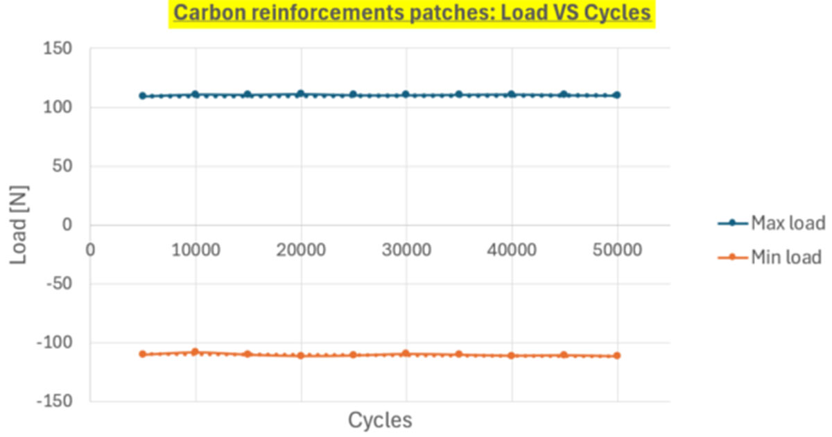 Line graph of load versus cycles for carbon reinforcement patches, with consistent maximum load near 110 N and minimum load near -110 N across 50,000 cycles.