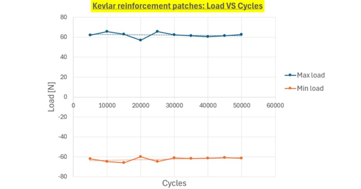Line graph of load versus cycles for Kevlar reinforcement patches, with maximum load around 60–65 N and minimum load near -60 N, showing slight variations over time.