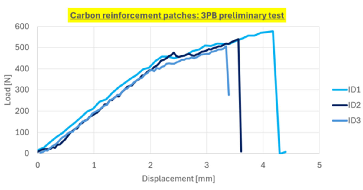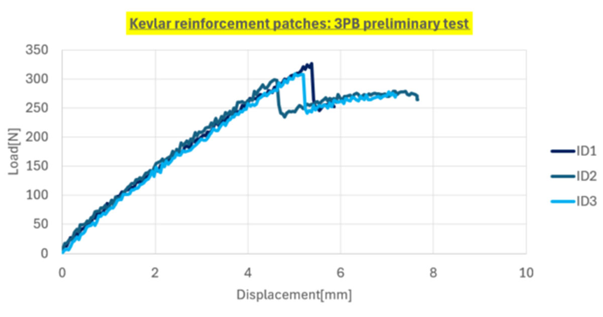 Method: to evaluate the performance of the adhesive used to bond the reinforced patches onto the PETG specimens, a durability test under force control was carried out through cyclic loading using a three-point bending (3PB) setup. Two specimens were tested: the first consisted of a 3 mm thick PETG sample with two-layer carbon fiber reinforcement patches bonded to both ends (resulting in a total thickness of 5.25 mm), and the second consisted of a 3 mm thick PETG sample with two-layer Kevlar reinforcement patches bonded to both ends (resulting in a total thickness of 4.8 mm), both specimens were 130 mm long and the adhesive was left to cure for 16 hours. The specimens were clamped at both ends and at the center, with the central clamp acting as the movable grip.