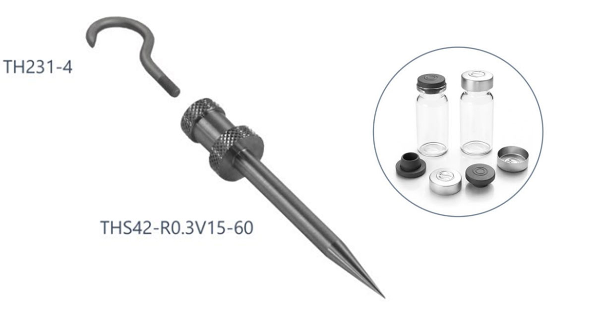 Precision stainless-steel piercing needle with knurled grip and hook tool for testing infusion bottle closures according to ISO 8536-2, with inset showing glass infusion bottles and rubber stoppers.