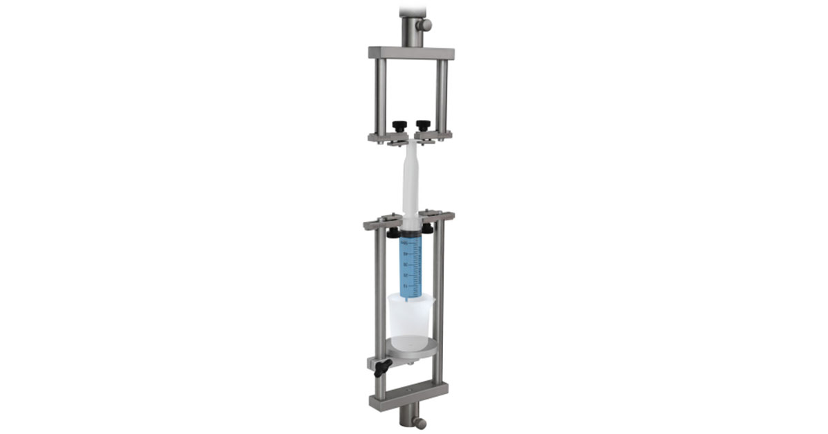 Vertical stainless-steel syringe holder fixture with clamps securing a syringe and collection container below, used for laboratory tension and compression testing of medical syringes.